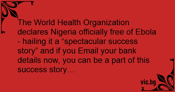The World Health Organization declares Nigeria officially free of Ebola - hailing it a “spectacular success story” and if you Email your bank details now, you can be a part of this success story…