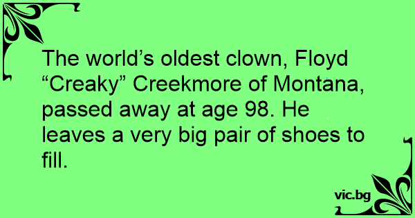 The world’s oldest clown, Floyd “Creaky” Creekmore of Montana, passed away at age 98. He leaves a very big pair of shoes to fill.