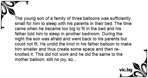 The young son of a family of three balloons was sufficiently small for him to sleep with his parents in their bed. The time came when he became too big to fit in the bed and his father told him to sleep in another bedroom. During the night the son was afraid and went back to his parents but could not fit. He undid the knot in his father balloon to make him smaller and thus create some space and then re-knotted it. This did not work and he did the same to the mother balloon, still no joy, so he did the same to himself and eventually managed to snuggle in. The next day the father saw his son and very angry he said, “Son you’ve let me down, your mother down and worst of all you've let yourself down.”