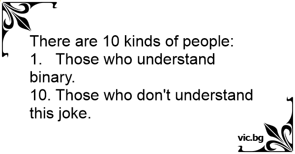 Съществуват 10 вида хора. Тези които разбират двоичен код, и тези които не го разбират.