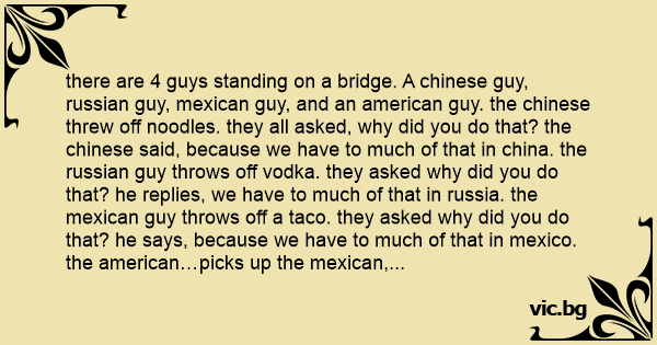 there are 4 guys standing on a bridge. A chinese guy, russian guy, mexican guy, and an american guy. the chinese threw off noodles. they all asked, why did you do that? the chinese said, because we have to much of that in china. the russian guy throws off vоdка. they asked why did you do that? he replies, we have to much of that in russia. the mexican guy throws off a taco. they asked why did you do that? he says, because we have to much of that in mexico. the american…picks up the mexican, and throws him. they all asked WHY DID YOU DO THAT! the american replies, oh because we have tooooo many of "those" in america.