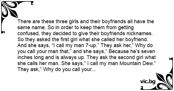 There are these three girls and their boyfriends all have the same name. So in order to keep them from getting confused, they decided to give their boyfriends nicknames. So they asked the first girl what she called her boyfriend. And she says, “I call my man 7-up.” They ask her,” Why do you call your man that,” and she says,” Because he’s seven inches long and is always up. They ask the second girl what she calls her man. She says,” I call my man Mountain Dew.” They ask,” Why do you call your man that,” and she says,” Because he likes to Mount me and to Do me.” They ask the third girl the same thing and she says, “I like to call my man Jack Daniels.” They look at her puzzled and say,” Why do you call your man that, Jack Daniels is a Hard Liquor,” and she says, “Exactly.”