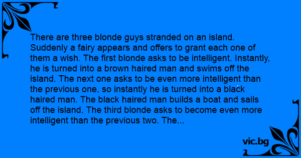 There are three blonde guys stranded on an island. Suddenly a fairy appears and offers to grant each one of them a wish. The first blonde asks to be intelligent. Instantly, he is turned into a brown haired man and swims off the island. The next one asks to be even more intelligent than the previous one, so instantly he is turned into a black haired man. The black haired man builds a boat and sails off the island. The third blonde asks to become even more intelligent than the previous two. The fairy turns him into a woman, and she walks across the bridge.