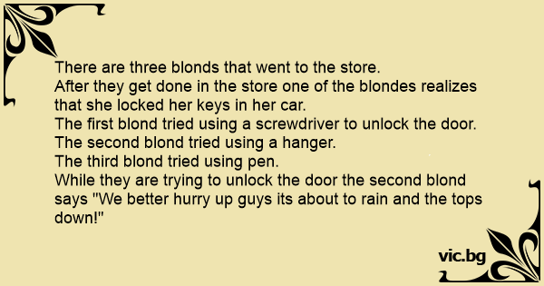 Det var en gang to blondine som var å handlet. Da de kom tilbake til bilen, fant de ut at nøklen var låst inne. De to blondinene sto der i mange timer for å prøve å få opp døren, men til ingen...