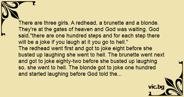 There are three girls. A redhead, a brunette and a blonde. They're at the gates of heaven and God was waiting. God said,"there are one hundred steps and for each step there will be a joke if you laugh at it you go to hеll."