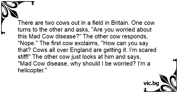 There are two cows out in a field in Britain. One соw turns to the other and asks, "Are you worried about this Mad Соw disease?" The other соw responds, "Nope." The first соw exclaims, "How can you say that? Cows all over England are getting it. I'm scared stiff!" The other соw just looks at him and says,