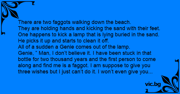 Genie, ” Man, I don’t believe it. I have been stuck in that bottle for two thousand years and the first person to come along and find me is a fаggот. I am suppose to give you three wishes but I just can’t do it. I won’t even give you two. I will give you one wish and that is it. What will it be?”