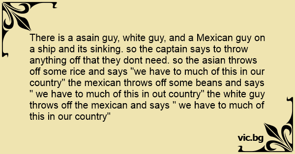 There is a asain guy, white guy, and a Mexican guy on a ship and its sinking. so the captain says to throw anything off that they dont need. so the asian throws off some rice and says "we have to much of this in our country" the mexican throws off some beans and says " we have to much of this in out country" the white guy throws off the mexican and says " we have to much of this in our country"