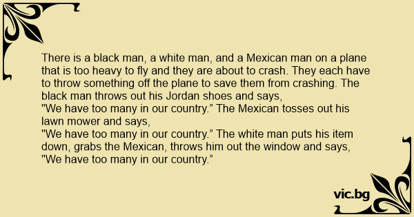 There is a black man, a white man, and a Mexican man on a plane that is too heavy to fly and they are about to crash. They each have to throw something off the plane to save them from crashing. The black man throws out his Jordan shoes and says,