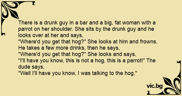 There is a drunк guy in a bar and a big, fат woman with a parrot on her shoulder. She sits by the drunк guy and he looks over at her and says,