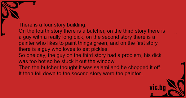 On the fourth story there is a butcher, on the third story there is a guy with a really long diск, on the second story there is a painter who likes to paint things green, and on the first story there is a guy who loves to eat pickles.