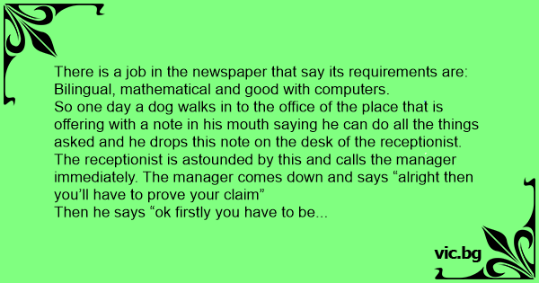 So one day a dog walks in to the office of the place that is offering with a note in his mouth saying he can do all the things asked and he drops this note on the desk of the receptionist.