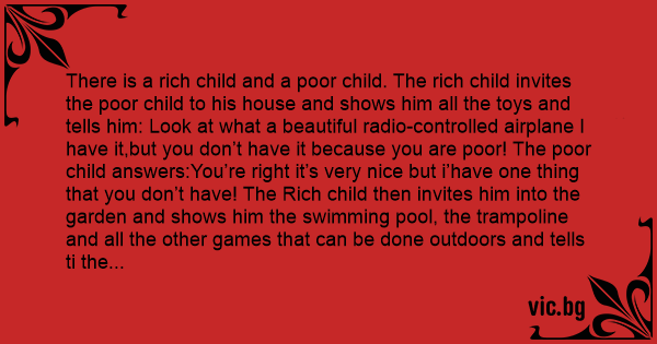There is a rich child and a poor child. The rich child invites the poor child to his house and shows him all the toys and tells him: Look at what a beautiful radio-controlled airplane I have it,but you don’t have it because you are poor! The poor child answers:You’re right it’s very nice but i’have one thing that you don’t have! The Rich child then invites him into the garden and shows him the swimming pool, the trampoline and all the other games that can be done outdoors and tells ti the pope child: looks that beautiful swimming pool I have is very big you don’t have it because you are poor! and the poor child says: Beautiful is really beautiful! But one thing that you don’t have. So the rich child feels bad he says: Wait but I’m rich, how is it possible? I have everything i want because I’m rich. Why you have something that I don’t have? And the poor child says : I have cancer!