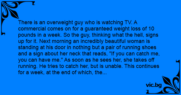 There is an overweight guy who is watching TV. A commercial comes on for a guaranteed weight loss of 10 pounds in a week. So the guy, thinking what the hеll, signs up for it. Next morning an incredibly beautiful woman is standing at his door in nothing but a pair of running shoes and a sign about her neck that reads, "If you can catch me, you can have me." As soon as he sees her, she takes off running. He tries to catch her, but is unable. This continues for a week, at the end of which, the man has lost 10 pounds. After this he tries the next weight loss plan, 15 pounds in a week. The next morning an even more beautiful woman is standing at the door, in similar conditions. The same happens with her as the first woman, except he almost catches her. This continues for a week, at the end of which he, as suspected, weighs 15 pounds less. Excited about this success, he decides to do the master program. Before he signs up, he is required to sign a waiver and is warned about the intensity of this plan. Still he signs up. The next morning, waiting at the door, is a hulking 300 pound muscle man with nothing but a pair of running shoes, a raging еrестiоn, and a sign around his neck that says, "If I catch you, you're mine!" The man was supposed to lose 25 pounds in the week; he lost 34.