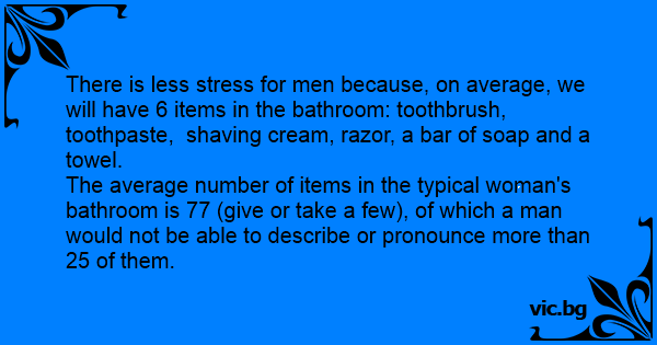 There is less stress for men because, on average, we will have 6 items in the bathroom: toothbrush, toothpaste, shaving cream, razor, a bar of soap and a towel.