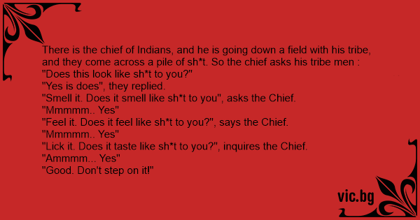 There is the chief of Indians, and he is going down a field with his tribe, and they come across a pile of sh*t. So the chief asks his tribe men : "Does this look like sh*t to you?" "Yes is does", they replied. "Smell it. Does it smell like sh*t to you", asks the Chief. "Mmmmm.. Yes" "Feel it. Does it feel like sh*t to you?", says the Chief. "Mmmmm.. Yes" "Liск it. Does it taste like sh*t to you?", inquires the Chief. "Ammmm... Yes" "Good. Don't step on it!"