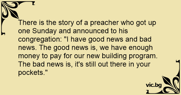 There is the story of a preacher who got up one Sunday and announced to his congregation: "I have good news and bad news. The good news is, we have enough money to pay for our new building program. The bad news is, it's still out there in your pockets."
