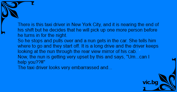 So he stops and pulls over and a nun gets in the car. She tells him where to go and they start off. It is a long drive and the driver keeps looking at the nun through the rear view mirror of his cab.