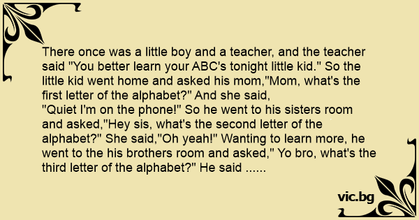 There once was a little boy and a teacher, and the teacher said "You better learn your ABC's tonight little kid." So the little kid went home and asked his mom,"Mom, what's the first letter of the alphabet?" And she said,