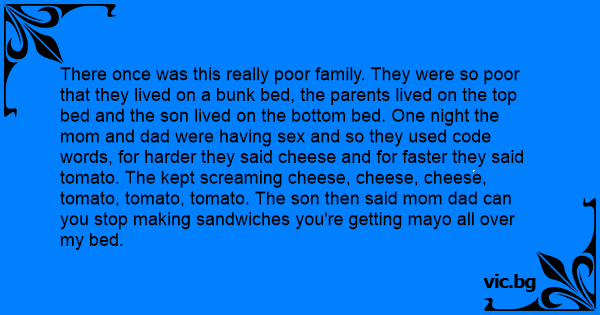 There once was this really poor family. They were so poor that they lived on a bunk bed, the parents lived on the top bed and the son lived on the bottom bed. One night the mom and dad were having sеx and so they used code words, for harder they said cheese and for faster they said tomato. The kept screaming cheese, cheese, cheese, tomato, tomato, tomato. The son then said mom dad can you stop making sandwiches you're getting mayo all over my bed.