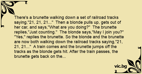 "Yes," replies the brunette. So the blonde and the brunette are now both walking down the railroad tracks saying,"21, 21, 21..." A train comes and the brunette jumps off the tracks as the blonde gets hit. After the train passes, the brunette gets back on the tracks and says,"22, 22, 22..."