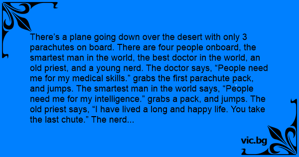 There’s a plane going down over the desert with only 3 parachutes on board. There are four people onboard, the smartest man in the world, the best doctor in the world, an old priest, and a young nerd. The doctor says, “People need me for my medical skills.” grabs the first parachute pack, and jumps. The smartest man in the world says, “People need me for my intelligence.” grabs a pack, and jumps. The old priest says, “I have lived a long and happy life. You take the last chute.” The nerd says, “Don’t worry. There are enough chutes for the both of us. The smartest man in the world just grabbed my backpack.”