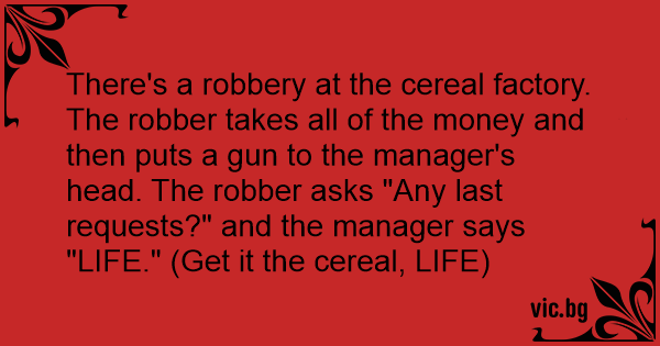 There's a robbery at the cereal factory. The robber takes all of the money and then puts a gun to the manager's head. The robber asks "Any last requests?" and the manager says "LIFE." (Get it the cereal, LIFE)