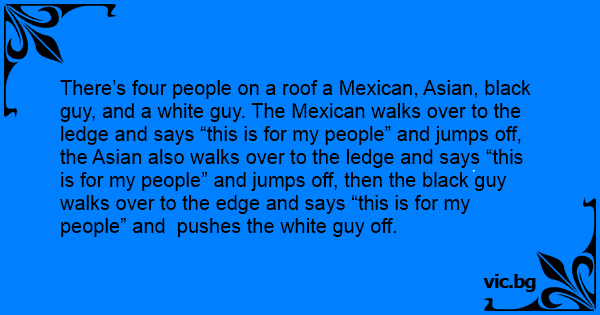 There’s four people on a roof a Mexican, Asian, black guy, and a white guy. The Mexican walks over to the ledge and says “this is for my people” and jumps off, the Asian also walks over to the ledge and says “this is for my people” and jumps off, then the black guy walks over to the edge and says “this is for my people” and pushes the white guy off.
