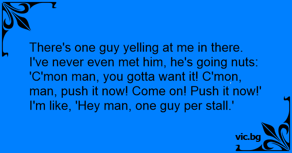 'C'mon man, you gotta want it! C'mon, man, push it now! Come on! Push it now!' I'm like, 'Hey man, one guy per stall.'
