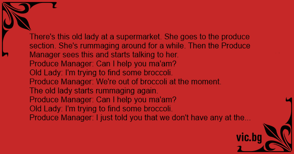 There's this old lady at a supermarket. She goes to the produce section. She's rummaging around for a while. Then the Produce Manager sees this and starts talking to her.