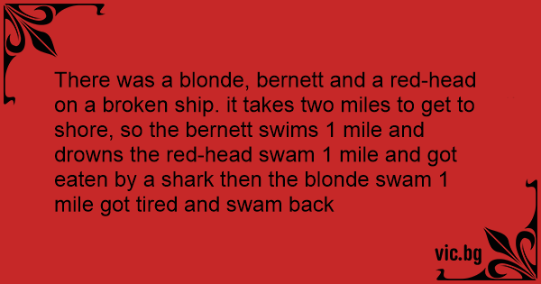 There was a blonde, bernett and a red-head on a broken ship. it takes two miles to get to shore, so the bernett swims 1 mile and drowns the red-head swam 1 mile and got eaten by a shark then the blonde swam 1 mile got tired and swam back