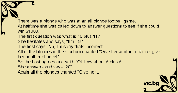 There was a blonde who was at an all blonde football game. At halftime she was called down to answer questions to see if she could win $1000. The first question was what is 10 plus 11? She hesitates and says, "hm.. 5!" The host says "No, I'm sorry thats incorrect." All of the blondes in the stadium chanted "Give her another chance, give her another chance!" So the host agrees and said, "Ok how about 5 plus 5." She answers and says "20". Again all the blondes chanted "Give her another chance, give her another chance." So the host agrees again and says, "OK, last chance, what is 2 plus 2." The blonde says "4!" and the audience says "Give her another chance give her another chance!"