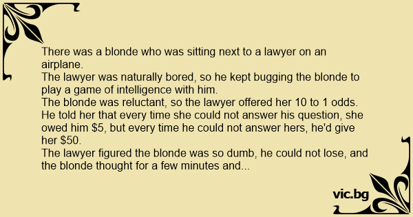Letí právník z Ameriky do Evropy a vedle něj sedí blondýnka. Právník navrhne, že by si mohli poměrně nudnou cestu zpříjemnit kvízem - otázka, odpověď. Nejdřív se bude ptát právník a blondýnka bude...