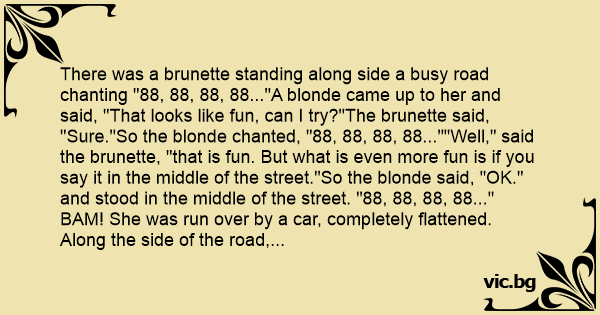 There was a brunette standing along side a busy road chanting "88, 88, 88, 88..."A blonde came up to her and said, "That looks like fun, can I try?"The brunette said, "Sure."So the blonde chanted, "88, 88, 88, 88...""Well," said the brunette, "that is fun. But what is even more fun is if you say it in the middle of the street."So the blonde said, "OK." and stood in the middle of the street. "88, 88, 88, 88..." BAM! She was run over by a car, completely flattened. Along the side of the road, the brunette began to chant, "89, 89, 89, 89..."