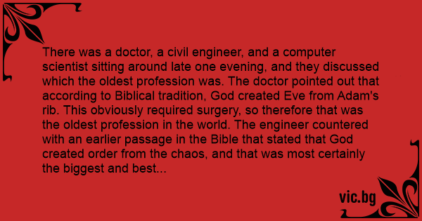 There was a doctor, a civil engineer, and a computer scientist sitting around late one evening, and they discussed which the oldest profession was. The doctor pointed out that according to Biblical tradition, God created Eve from Adam's rib. This obviously required surgery, so therefore that was the oldest profession in the world. The engineer countered with an earlier passage in the Bible that stated that God created order from the chaos, and that was most certainly the biggest and best civil engineering example ever, and also proved that his profession was the oldest profession. The computer scientist leaned back in her chair, and with a sly smile responded, "Yes, but whom do you think created the chaos?"