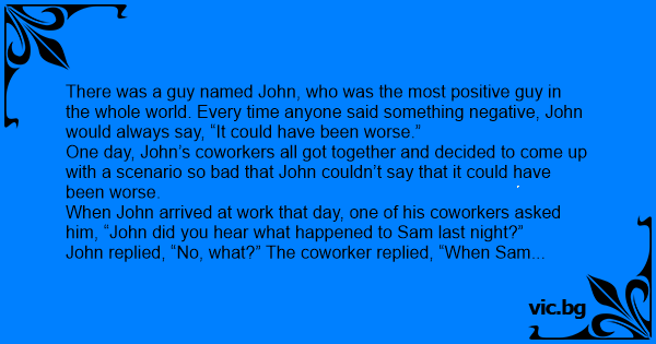 There was a guy named John, who was the most positive guy in the whole world. Every time anyone said something negative, John would always say, “It could have been worse.”
