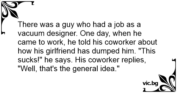 There was a guy who had a job as a vacuum designer. One day, when he came to work, he told his coworker about how his girlfriend has dumped him. "This suскs!" he says. His coworker replies,