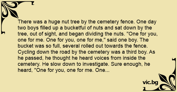 There was a huge nut tree by the cemetery fence. One day two boys filled up a bucketful of nuts and sat down by the tree, out of sight, and began dividing the nuts. "One for you, one for me. One for you, one for me," said one boy. The bucket was so full, several rolled out towards the fence.