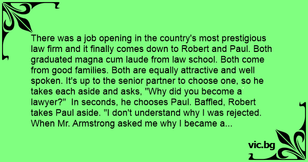 There was a job opening in the country's most prestigious law firm and it finally comes down to Robert and Paul. Both graduated magna сuм laude from law school. Both come from good families. Both are equally attractive and well spoken. It's up to the senior partner to choose one, so he takes each aside and asks, "Why did you become a lawyer?" In seconds, he chooses Paul. Baffled, Robert takes Paul aside. "I don't understand why I was rejected. When Mr. Armstrong asked me why I became a lawyer, I said that I had the greatest respect for the law, that I'd lay down my life for the Constitution and that all I wanted was to do right by my clients. What in the world did you tell him?"