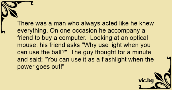 There was a man who always acted like he knew everything. On one occasion he accompany a friend to buy a computer. Looking at an optical mouse, his friend asks "Why use light when you can use the ball?" The guy thought for a minute and said; "You can use it as a flashlight when the power goes out!"