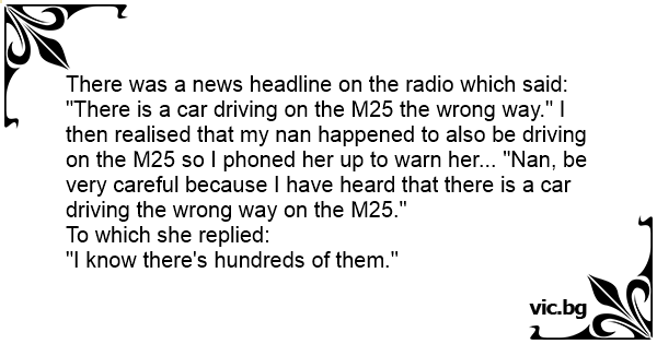 "There is a car driving on the M25 the wrong way." I then realised that my nan happened to also be driving on the M25 so I phoned her up to warn her... "Nan, be very careful because I have heard that there is a car driving the wrong way on the M25."