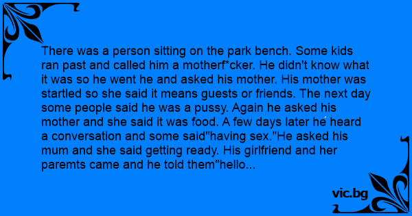 There was a person sitting on the park bench. Some kids ran past and called him a motherf*cker. He didn't know what it was so he went he and asked his mother. His mother was startled so she said it means guests or friends. The next day some people said he was a рussy. Again he asked his mother and she said it was food. A few days later he heard a conversation and some said"having sеx."He asked his mum and she said getting ready. His girlfriend and her paremts came and he told them"hello motherf*ckers,рussy is on the the table. Mm and dad are having sеx.