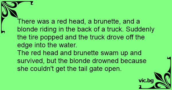There was a red head, a brunette, and a blonde riding in the back of a truck. Suddenly the tire popped and the truck drove off the edge into the water.
