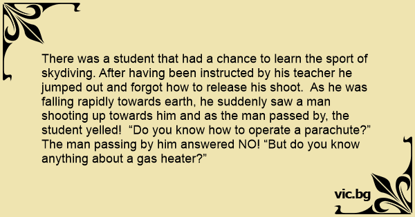 There was a student that had a chance to learn the sport of skydiving. After having been instructed by his teacher he jumped out and forgot how to release his shoot. As he was falling rapidly towards earth, he suddenly saw a man shooting up towards him and as the man passed by, the student yelled! “Do you know how to operate a parachute?” The man passing by him answered NO! “But do you know anything about a gas heater?”