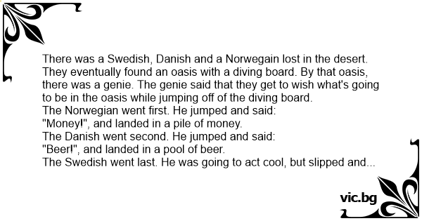 There was a Swedish, Danish and a Norwegain lost in the desert. They eventually found an oasis with a diving board. By that oasis, there was a genie. The genie said that they get to wish what's going to be in the oasis while jumping off of the diving board.