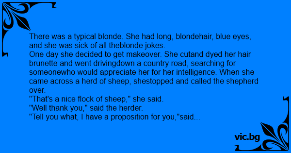 There once was a blonde who was very tired of blonde jokes and insults directed at her intelligence. So, she cut and dyed her hair, got a make-over, got in her car, and began driving around in the country. Suddenly, she came to a herd of sheep in the road. She stopped her car and went over to the...