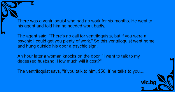 The agent said, "There's no call for ventriloquists, but if you were a psychic I could get you plenty of work." So this ventriloquist went home and hung outside his door a psychic sign.