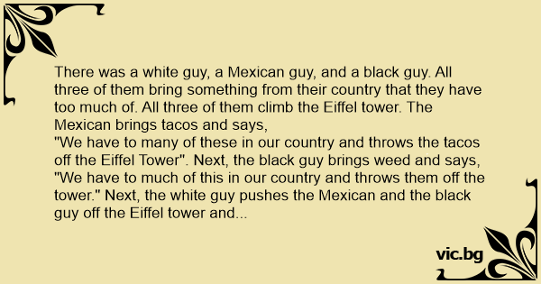 There was a white guy, a Mexican guy, and a black guy. All three of them bring something from their country that they have too much of. All three of them climb the Eiffel tower. The Mexican brings tacos and says,