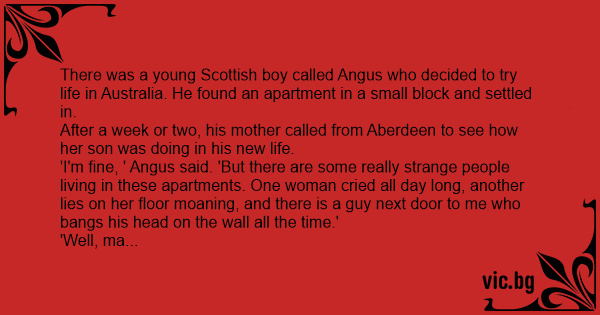 Egy skót fiú, Angus, elköltözik Ausztráliába. Talál egy olcsó társasházi lakást, kiveszi. Néhány héttel később telefonál az anyja, érdeklődik, hogy milyen az új hely, hogy érzi magát a fiacskája. -...