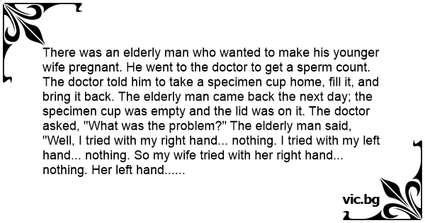 There was an elderly man who wanted to make his younger wife pregnant. He went to the doctor to get a sреrм count. The doctor told him to take a specimen cup home, fill it, and bring it back. The elderly man came back the next day; the specimen cup was empty and the lid was on it. The doctor asked, "What was the problem?" The elderly man said, "Well, I tried with my right hand... nothing. I tried with my left hand... nothing. So my wife tried with her right hand... nothing. Her left hand... nothing. Her mouth... nothing. Then my wife's friend tried. Right hand, left hand, mouth... still nothing. The doctor replied, "Wait a minute, did you say your wife's friend too?!" The elderly man answered, "Yeah, and we still couldn't get the lid off of the specimen cup."